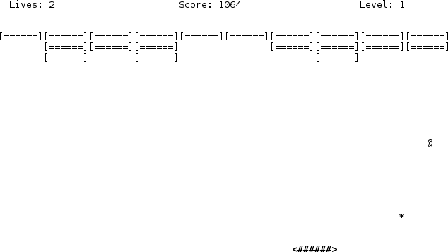 Bricktick is an Arkanoid/brickbreaker/brick attack clone for the UNIX console, utilizing the curses (on many systems ncurses) library. It runs in a 80x24 console or bigger, but does not scale to bigger consoles. It supports color, 'charms' that include life, slow ball, and 1000 score, and has seven levels ranging from the infantile to the challenging. Controls: Space is pause, ESC is exit, arrow keys control the paddle. Hit the left side of the paddle and the ball bounces to the left, hit the right side of the paddle and the ball bounces to the right, hit the center of the paddle and it either bounces straight up or continues on its original horizontal course. Score: +2 score for every second you manage not to die, +100 for a brick, and +1000 when you catch the '%' charm. Levels: First couple are easy, fifth level gets quite difficult, last two levels have smaller bricks. Downloads: Bricktick 0.9 can be downloaded here. Repo: Github A precompiled 64-bit Windows binary for 0.9 can be found here, and an Intel x86_64 unsigned macOS binary can be found here. Screenshots: ______________________________________________________ Greeting screen: Bricktick: Arkanoid/Brickbreaker for the UNIX console